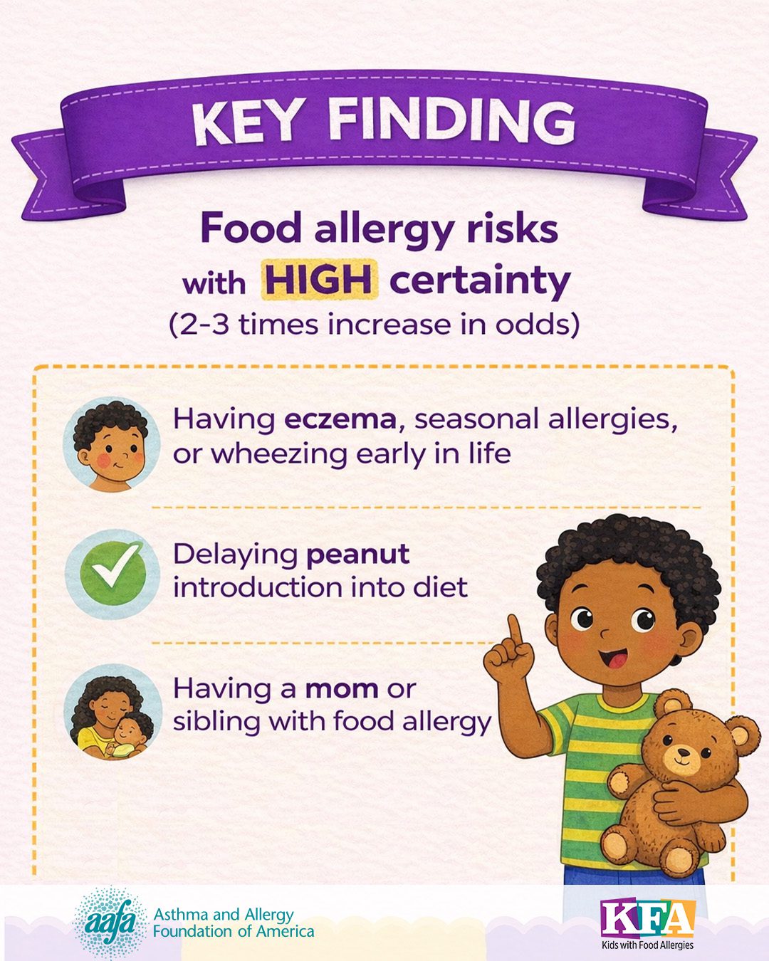 “The study confirms that the risk of a child developing food allergy is relatively low - less than 5 out of 100 babies will develop food allergy,” said Matthew Greenhawt, MD, AAFA’s Chief Medical Officer, a study co-author and the implementation chair for the food allergy practice parameter update. “The study identified 342 risk factors, but the results tell us that there is no single cause or risk for food allergy. Among the risk factors associated with high certainty of developing food allergy are having eczema, seasonal allergies, or wheezing early in life; delaying peanut introduction into diet; and having a mother or sibling with a food allergy. Vaccines are not associated with food allergy risk.”